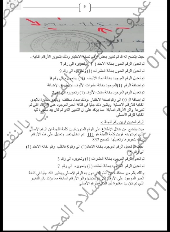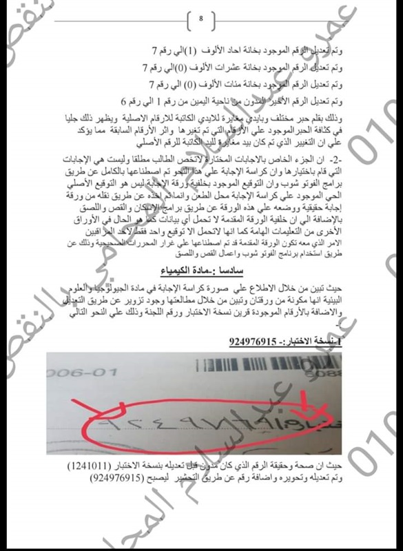 وأشار إلى أنه تم اصطناع كراسات الإجابة الخاصة بالطلاب علي غرار الكراسات الصحيحة باستخدام طرق التزوير المادي وذلك بتعديل وتحوير بعض أرقام كود نسخة الاختبار وأرقام اللجنة الامتحانية لتتفق مع نماذج الإجابة اليدوية التي تم إعدادها وفبركتها_ على حد وصفه_