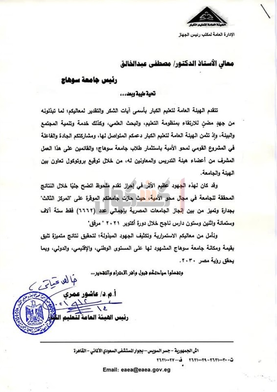 ومن جانبه أشار أحمد عبدالحافظ المستشار الإعلامي للجامعة، أن رئيس الجامعة قد توجه بأسمى ايات الشكر والتقدير والامتنان للدكتور خالد عبدالغفار وزير التعليم العالي والبحث العلمي، واللواء طارق الفقي محافظ سوهاج، والدكتور محمد لطيف أمين المجلس الأعلى للجامعات، والدكتور هلال الشربيني رئيس اللجنة العليا لتعليم الكبار، والدكتور عاشور عمري رئيس الهيئة القومية لتعليم الكبار، لدعمهم اللا محدود للجامعة في هذا المجال.