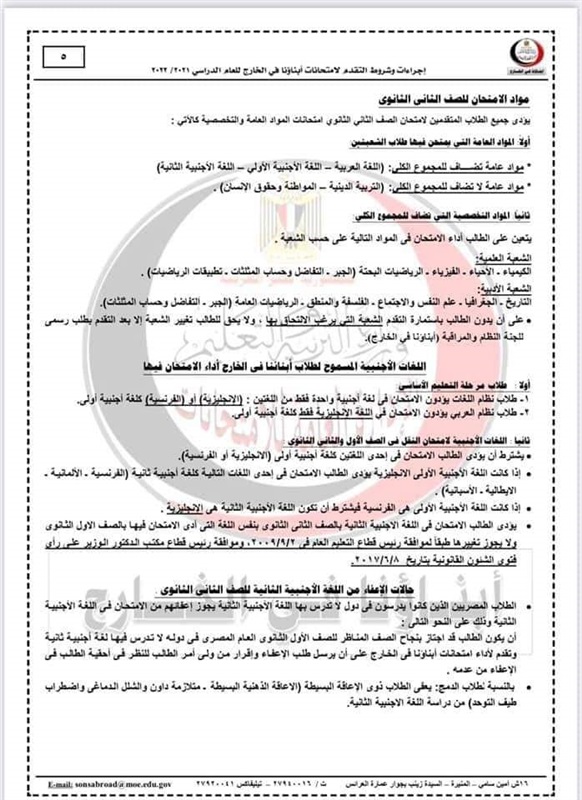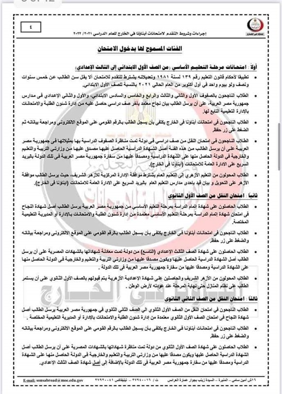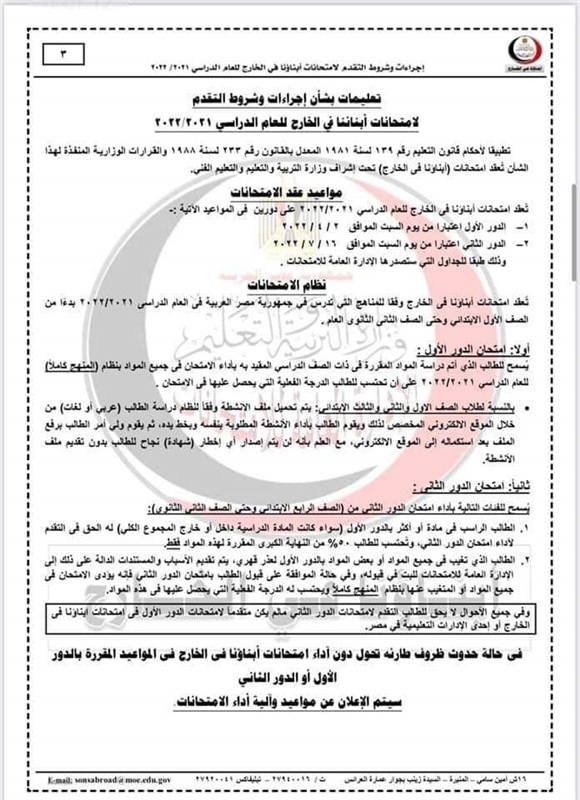 وأشارت إلى أنه يمكن لأولياء الأمور معرفة إجراءات التقدم لامتحانات “أبناؤنا في الخارج “والتسجيل الإلكتروني من خلال الموقع الرسمي لوزارة التربية والتعليم المصرية -صفحة ابناؤنا في الخارج.