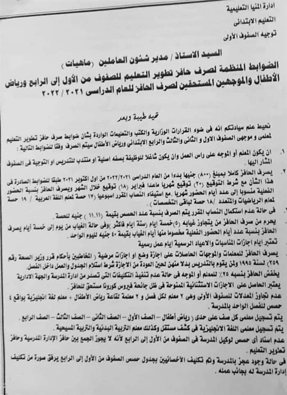 _ يصرف الحافز كاملا بمبلغ 800 جنيهًا بدءًا من العام الدراسي 2021_ 2022 من أول أكتوبر طبقا للضوابط الصادرة في هذا الشأن مع شرط التوقيع 21 يوم شهريا ويصرف الحافز بنسبة الحضور