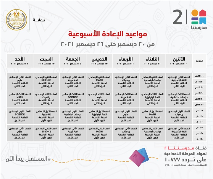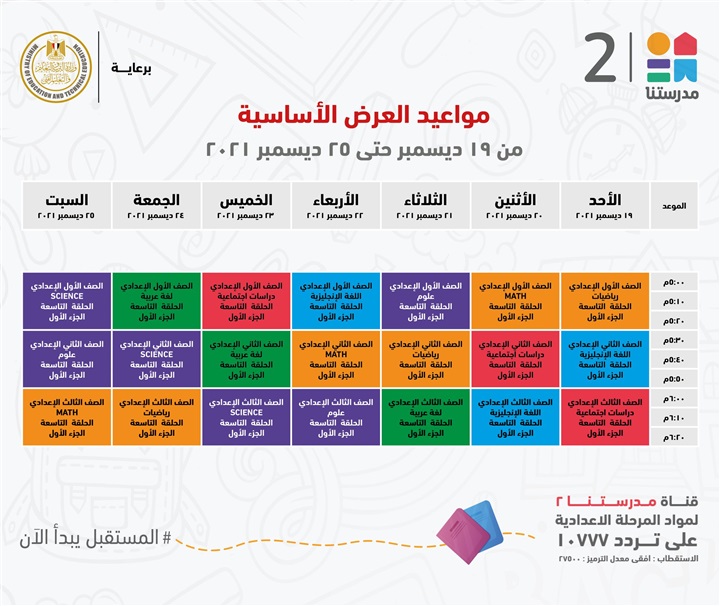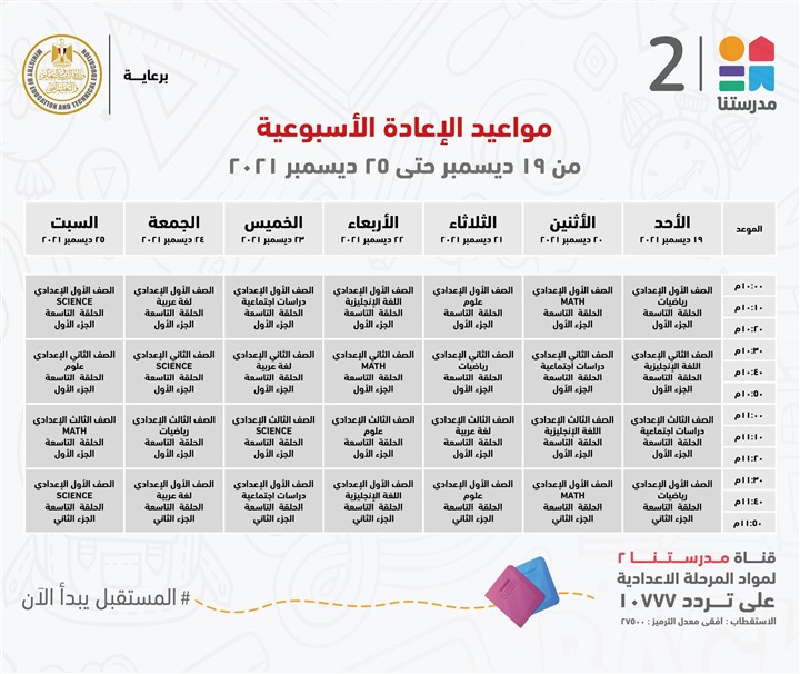 أعلنت وزارة التربية والتعليم والتعليم الفن، مواعيد عرض البرامج التعليمية للصفوف الاعدادية، قناة مدرستنا 2، لجميع المواد ، للاسبوع الجاري من 19 ديسمبر وحتى 25 ديسمبر.