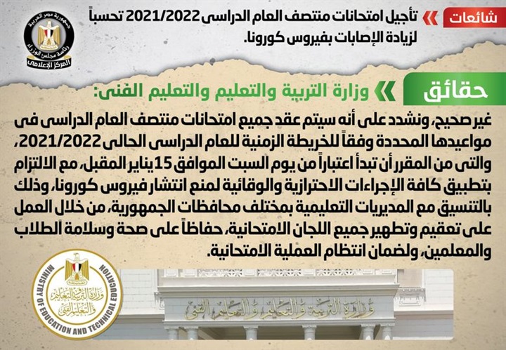 أكد المركز الإعلامي لمجلس الوزراء عدم صحة الأنباء المتداولة على بعض المواقع الإلكترونية وصفحات التواصل الاجتماعى، بشأن تأجيل امتحانات منتصف العام الدراسي 2021/2022 تحسباً لزيادة الإصابات بفيروس كورونا.
