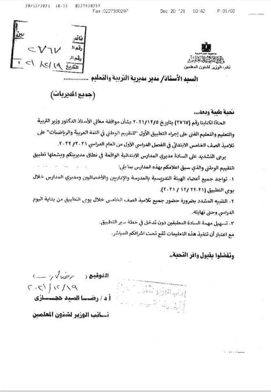«انه الحاقا لكتابنا رقم ۲۷٦۷ بتاریخ ۲۰۲۱/۱۲/٥ بشأن موافقة وزير التربية والتعليم والتعليم الفني على إجراء التطبيق الأول "للتقييم الوطني في اللغة العربية والرياضيات" على تلاميذ الصف الخامس الابتدائي في الفصل الدراسي الأول من العام الدراسي ۲۰۲۲/۲۰۲۱».