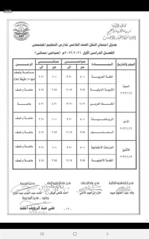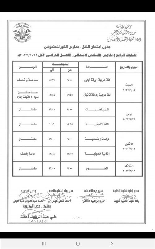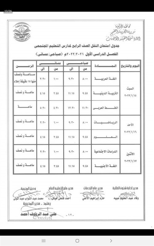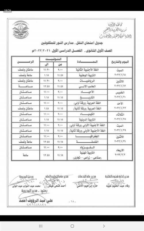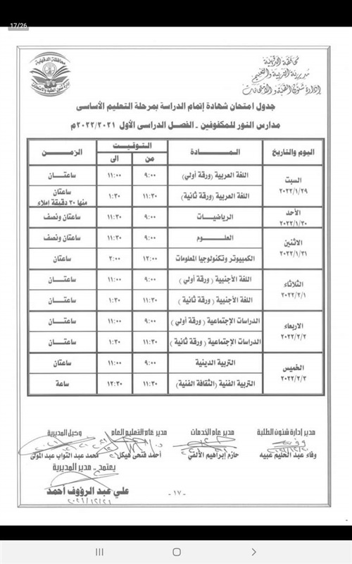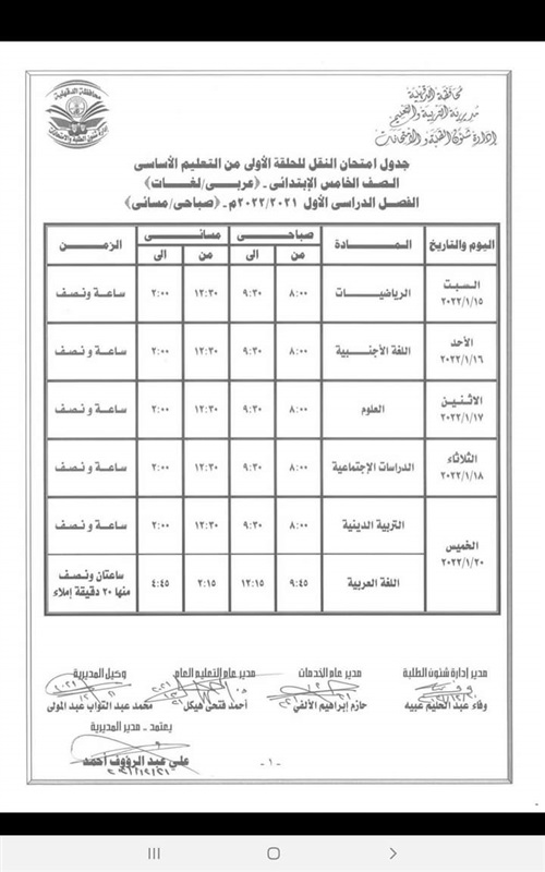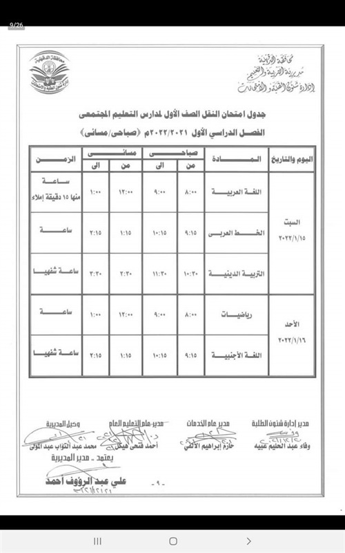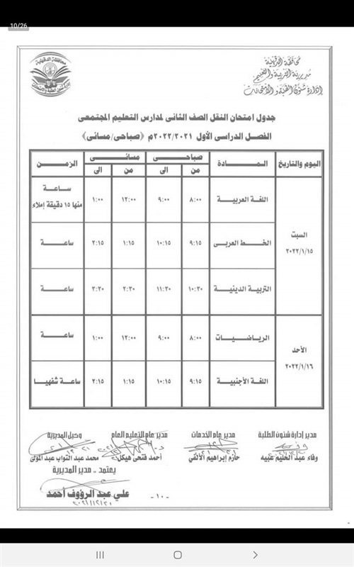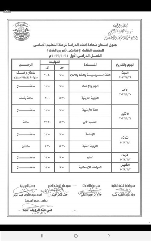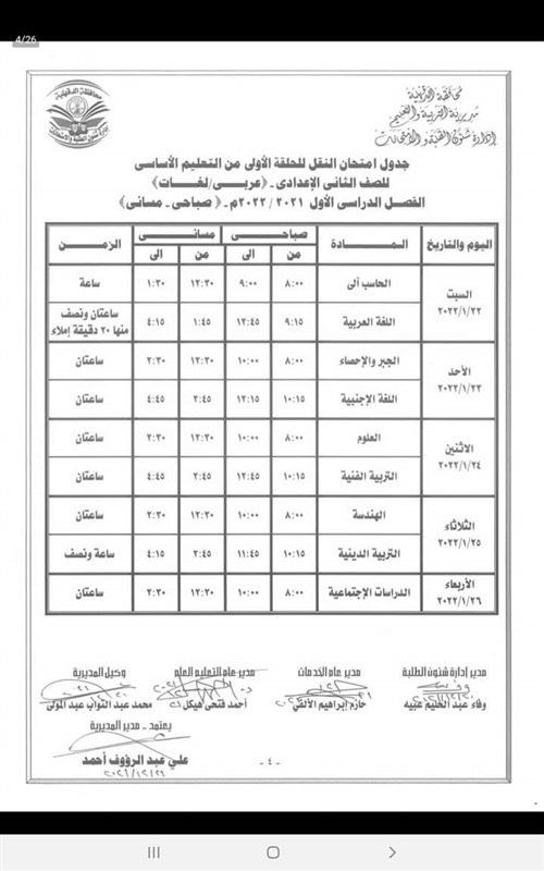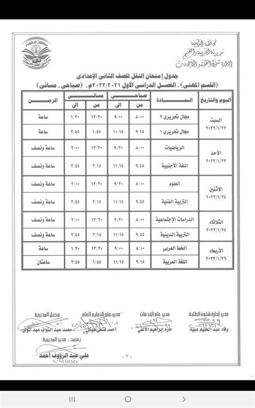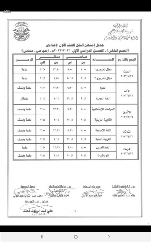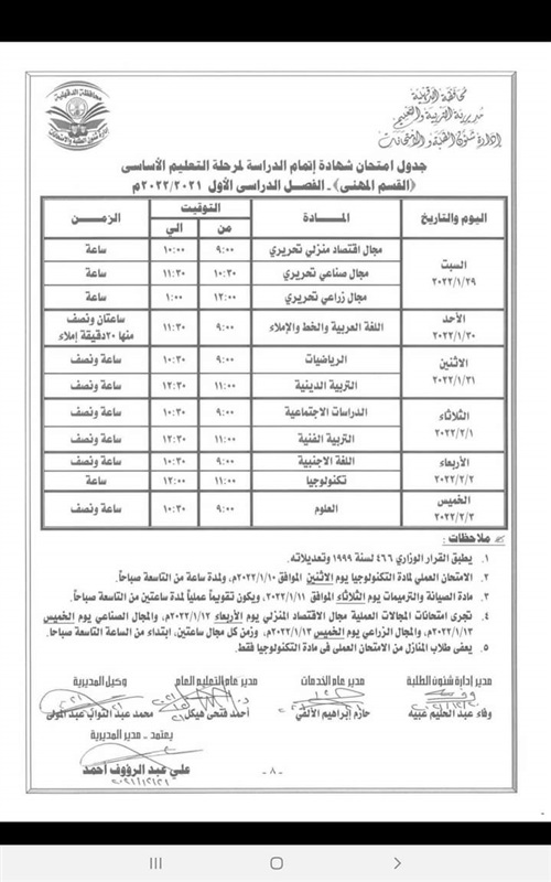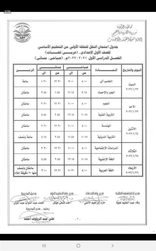 كما اعتمد " المحافظ " جدول امتحانات إتمام الدراسة لمرحلة التعليم الأساسي " الشهادة الاعدادية العامة والمهنية " والتي المقرر لها أن تبدأ يوم 29 يناير وتنتهي يوم 3 فبراير القادم .