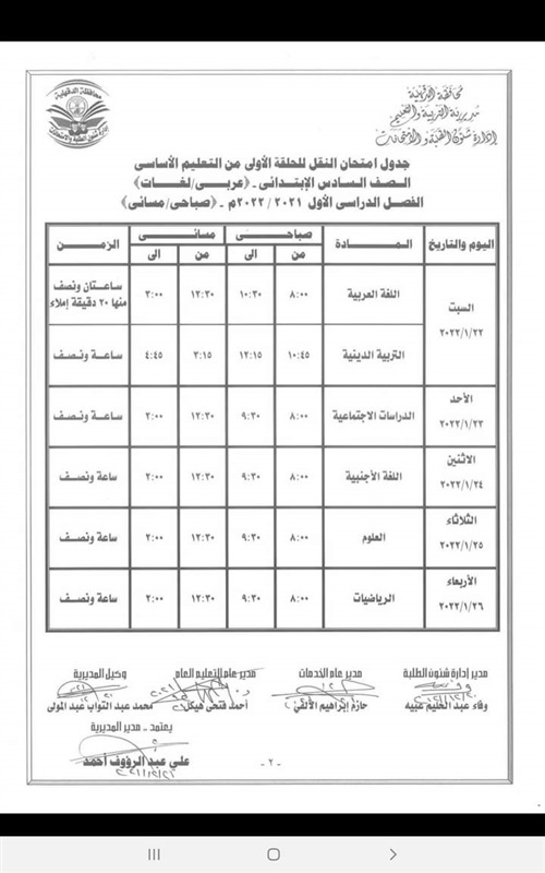محافظ الدقهلية يعتمد جدول امتحانات النقل للفصل الدراسى الاول