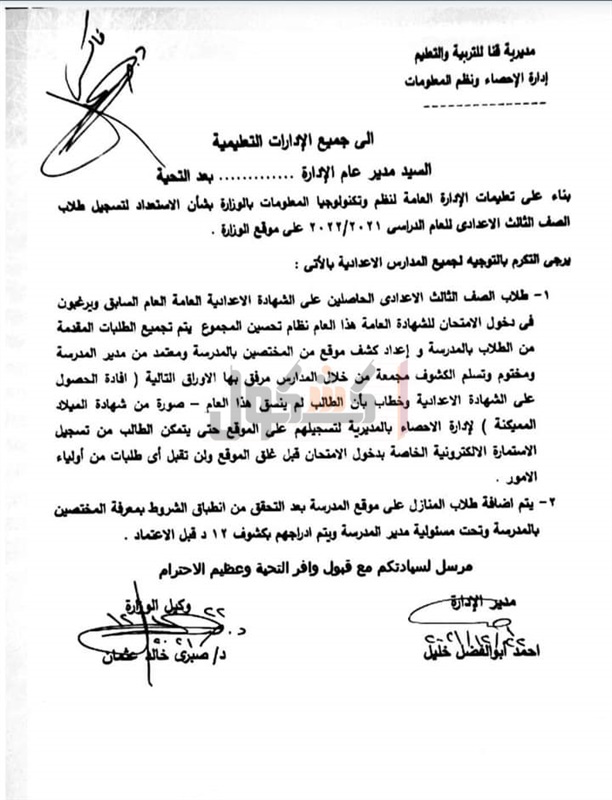 ووجهت الوزارة جميع المدارس الإعدادية بالآتي: