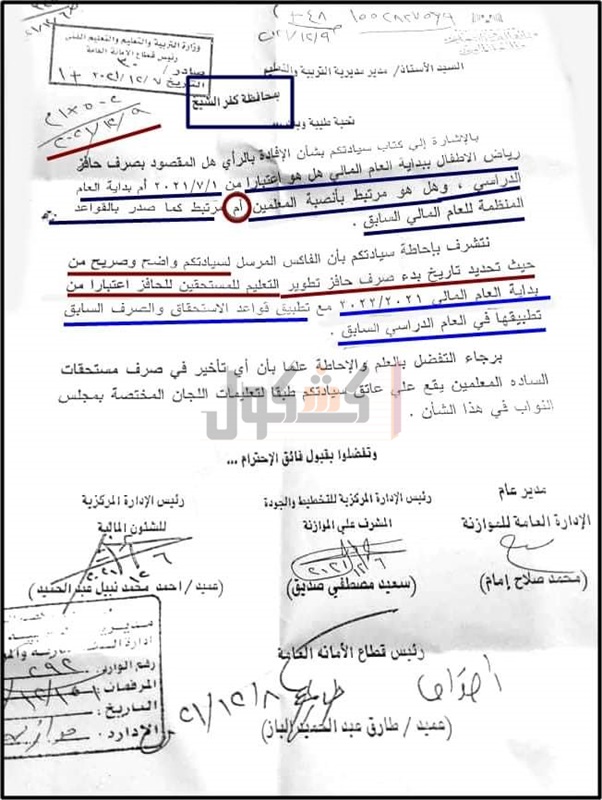 وأوضحت أنه تم تحديد تاريخ بدء صرف حافز تطوير التعليم اعتبارُا من بداية العام الحالي 2021_ 2022 مع تطبيق قواعد الاستحقاق والصرف السابق تطبيقها في العام الدراسي السابق.