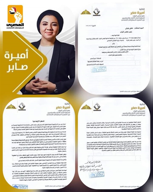 تقدمت النائبة أميرة صابر قنديل، عضو الهيئة البرلمانية للحزب المصري الديمقراطي الاجتماعي، وعضو تنسيقية شباب الأحزاب والسياسيين باقتراح برغبة إلى المستشار/ حنفي جبالي، رئيس مجلس النواب موجه إلى مصطفى مدبولي رئيس مجلس الوزراء، ونيفين القباج وزيرة التضامن الاجتماعي بشأن إعداد قاعدة بيانات موحدة ومحدثة عن الأشخاص ذوي الإعاقة لحصر أوضاعهم المعيشية.