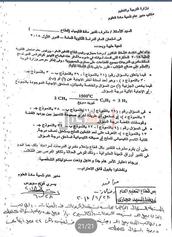 اعتمد الدكتور رضا حجازي، رئيس قطاع التعليم العام ورئيس امتحان الثانوية العامة، المذكرة التي رفعت إليه، بناء على ما أسفر عنه اجتماع "الفيديو كونفرانس" بين مستشار مادة الكيمياء، وجميع مقدري الدرجات على مستوى الجمهورية؛ للمناقشة في نموذج إجابة الامتحان قبل بدء تصحيح العينة العشوائية.
