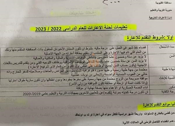 ووجهت «التعليم» الراغبين في التقدم لحركة الإعارات الجديدة عليهم مراجعة قسم الإعارات بالإدارة التعليمية التابع لها لسحب استمارة الترشيح والاطلاع على الشروط والمستندات المطلوبة .