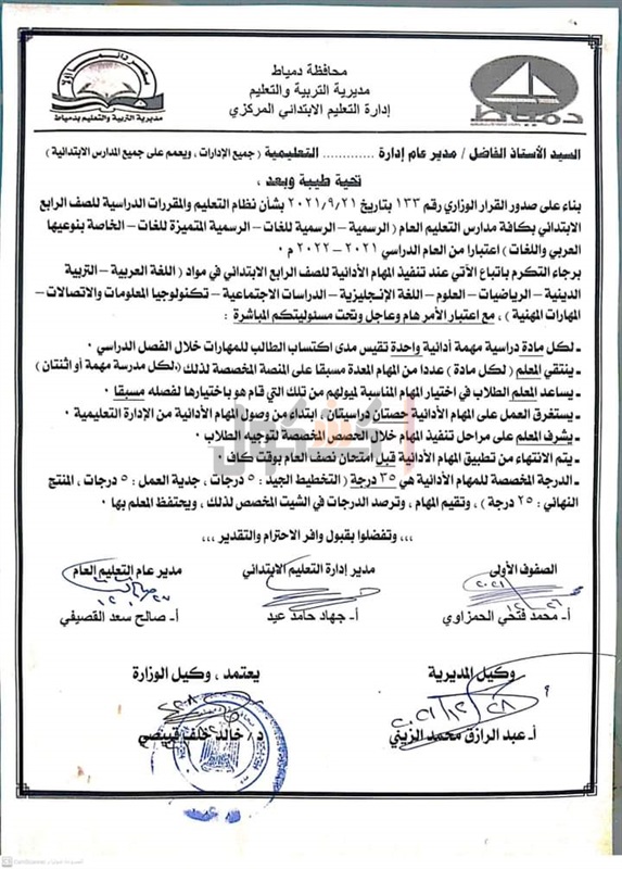 أصدرت مديرية التربية والتعليم بمحافظة دمياط خطاب رسمي بشأن نظام التعليم والمقررات الدراسية للصف الرابع الابتدائي بكافة المدارس للعام الدراسي 2021_ 2022، ووجهت بضرورة تنفيذ الآتي: