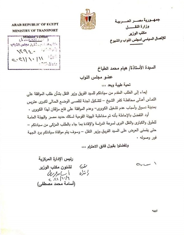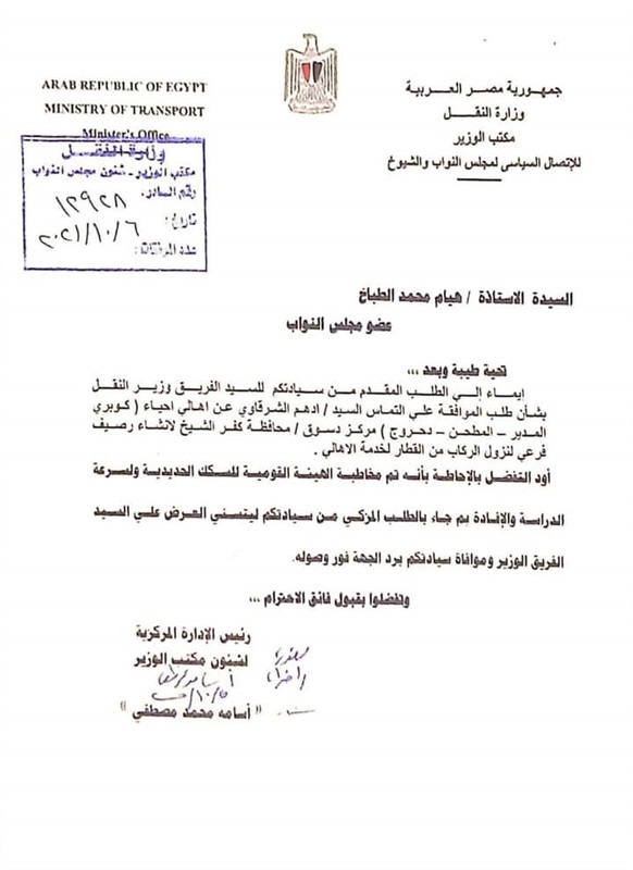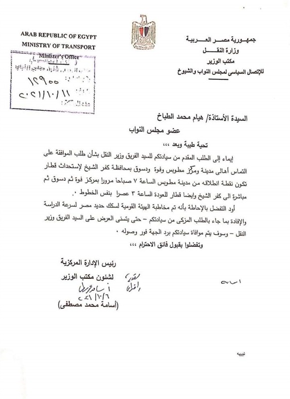 وأشارت إلى أن اقتراح قطار طلاب الجامعة السابعة صباحاً لينطلق من مطوبس مروراً بفوه - دسوق - قلين "" مراكز فقط "" انتهاء بكفرالشيخ يصل التاسعة إلا ربع مع مسار عودة ما بعد الثانية ظهراً وقت انتهاء المحاضرات