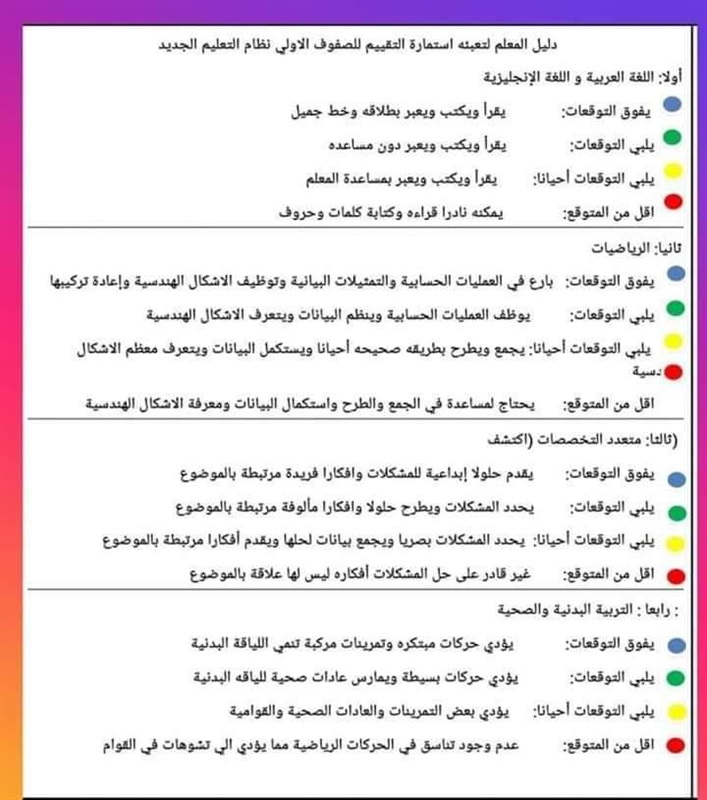 تعرف على التقييمات الملونة للصفوف الأولي في نظام التعليم الجديد