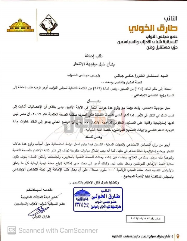 تقدم النائب طارق الخولي عضو مجلس النواب عن تنسيقية شباب الأحزاب والسياسيين بطلب إحاطة بشأن سُبل مواجهة الانتحار.