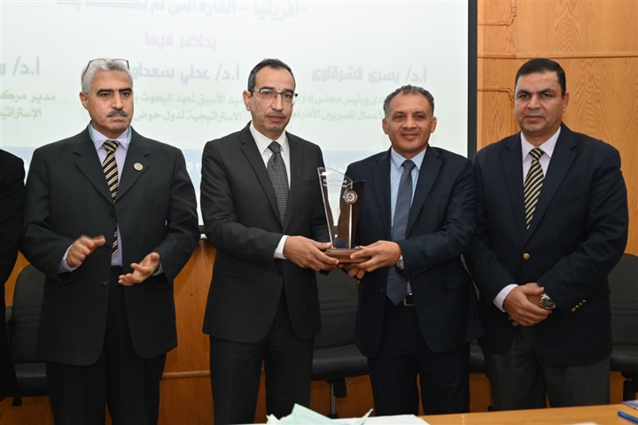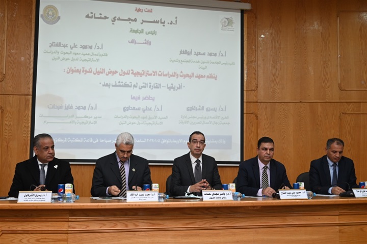 وذلك بحضور الدكتور محمد سعيد أبو الغار، نائب رئيس الجامعة لشئون خدمة المجتمع وتنمية البيئة، والدكتور محمد فاروق الخبيري نائب رئيس الجامعة لشئون التعليم والطلاب، والدكتور عرفه صبري حسن نائب رئيس الجامعة لشئون الدراسات العليا والبحوث، والدكتور محمود علي عبدالفتاح، القائم بأعمال عميد معهد البحوث والدراسات الاستراتيجية لدول حوض النيل، وبحضور عمداء الكليات وعمداء المعهد السابقون وأعضاء هيئة التدريس والطلاب.