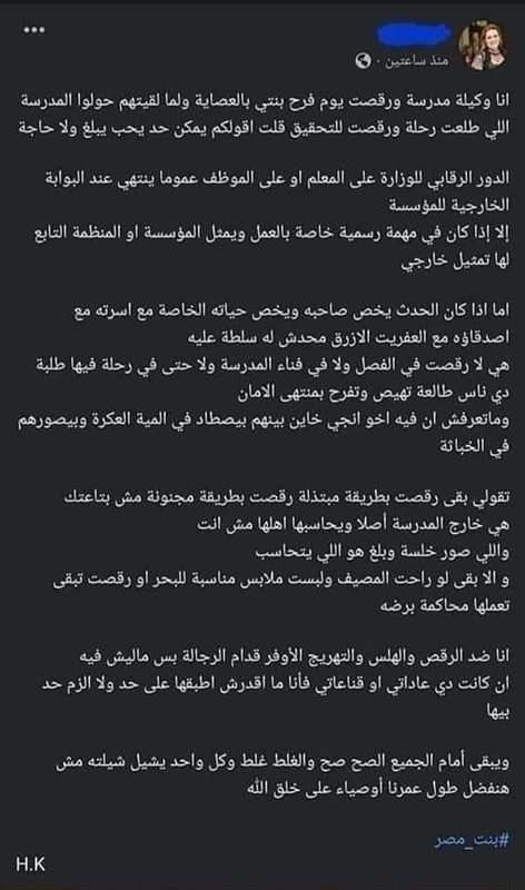 قالت في منشور على صفحتها بموقع التواصل الاجتماعي فيس بوك، (أنا وكيلة مدرسة ورقصت يوم فرح بنتي بالعصاية ولما لقيتهم حولوا المدرسة اللي طلعت رحلة ورقصت للتحقيق قلت أقولكم يمكن حد يحب يبلغ ولا حاجة).