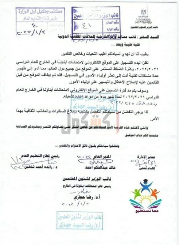 وقررت مد فترة التسجيل على الموقع الالكتروني لامتحانات أبناؤنا في الخارج للعام الدراسي 2021/2022 لمدة شهر بدءا من موعد اعادة تشغيله.