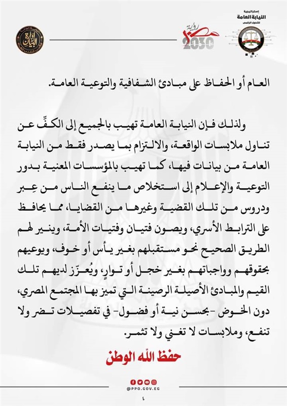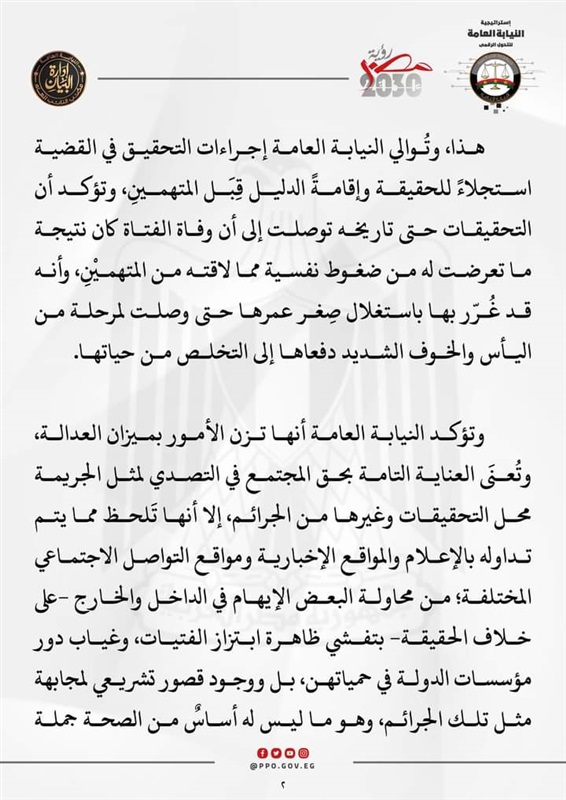 وأكدت النيابة العامة أنها تزن الأمور بميزان العدالة، وتعني العناية التامة بحق المجتمع المصري لمثل الجريمة محل التحقيقات وغيرها من الجرائم، إلا أنها تلحظ مما يتم تداوله بالإعلام والمواقع الإخبارية ومواقع التواصل الاجتماعي من محاولة البعض الإيهام في الداخل والخارج على خلاف الحقيقة بتفشي ظاهرة ابتزاز الفتيات وغياب دور مؤسسات الدولة في حمايتهن، بل ووجود قصور تشريعي لمجابهة مثل تلك الجرائم وهو ما ليس له أساس من الصحة.