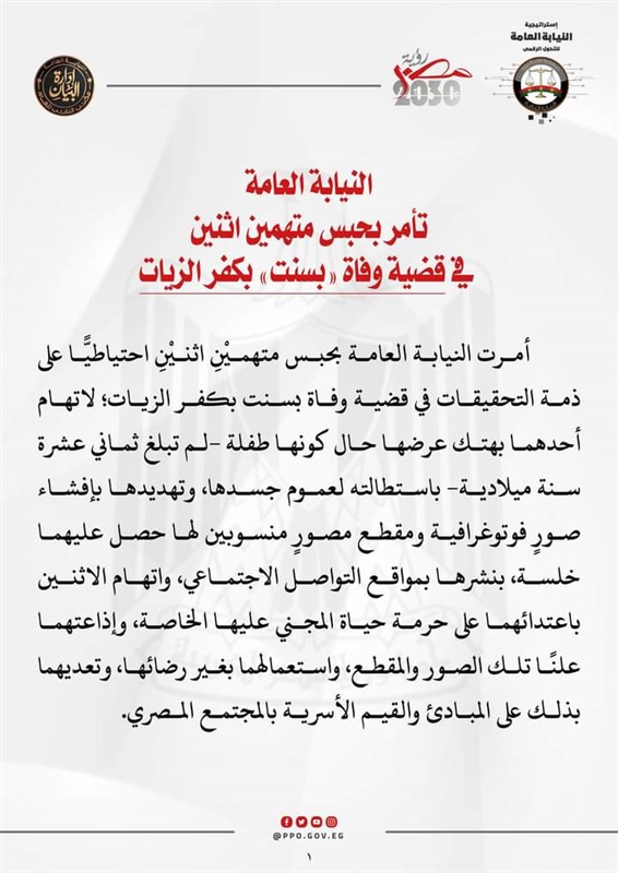 أمرت النيابة العامة بحبس متهمين اثنين احتياطيا على ذمة التحقيقات في قضية وفاة بسنت بكفر الزيات، لاتهام أحدهما بهتك عرضها حال كونها طفلة لم تبلغ ثماني عشر سنة، باستطالته لعموم جسدها، وتهديدها بإفشاء صور فوتوغرافية ومقطع مصور منسوبين لها حصل عليهما خلسة، بنشرها بمواقع التواصل الاجتماعي، واتهام الاثنين باعتدائهما على حرمة حياة المجني عليها الخاصة، واذاعتهما علنًا تلك الصور والمقطع واستعمالهما بغير رضائها، وتعديهما بذلك على المبادئ والقيم الأسرية بالمجتمع المصري.