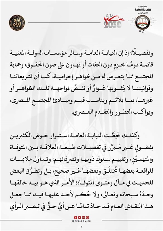 ولحظت النيابة استمرار خوض الكثيرين بفضول غير مبرر في تفصيلات طبيعة العلاقة بين المتوفاة والمتهمين، وتقييم سلوك ذويها وتداول ملابسات للواقعة بعضها مُختلق وغير صحيح، وتطرق البعض للحديث في مآل ومثوى المتوفاة.