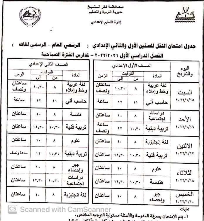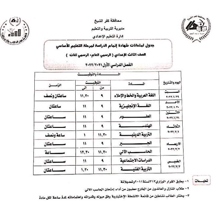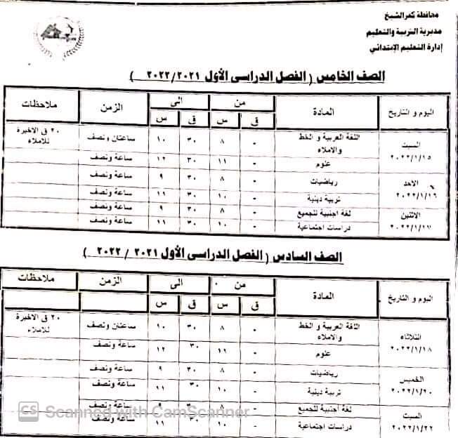 اعتمد اللواء جمال نورالدين، محافظ كفر الشيخ، جدول امتحانات الفصل الدراسي الاول للعام الدراسي 2022/2021م، لصفوف المرحلة الابتدائية والإعدادية " عام - مهني - تربية خاصة - تعليم مجتمعي - والتعليم الثانوي العام – الفنى"، بحضور محمد عبدالله، وكيل وزارة التربية والتعليم.