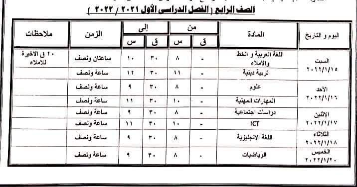 وأضاف اللواء جمال نورالدين، انه سيتم استمرار الدراسة لتلاميذ مرحلة رياض الأطفال والصفين الأول والثاني والثالث الابتدائي حتى يوم الخميس 3 فبراير 2022.وتبدأ امتحانات الفصل الدراسي الأول يوم السبت الموافق 15 يناير الجاري، فتبدأ امتحانات الصف الرابع الإبتدائي يوم 15 يناير الجاري حتى 20 يناير،وامتحان الصف الخامس الإبتدائي 15 يناير الجاري وتنتهي يوم 17 يناير، وامتحان الصف السادس الإبتدائي تبدأ يوم 18 يناير الجاري، وتنتهي 22 يناير.كما تبدأ امتحانات الصف الأول والثاني الإعدادي يوم السبت، الموافق 15 يناير الجاري وتنتهي يوم الخميس 20 يناير الجاري، وامتحانات الصف الثالث الإعدادي يوم السبت الموافق 29 يناير وتستمر حتى يوم الخميس الموافق 3 فبراير المقبل.