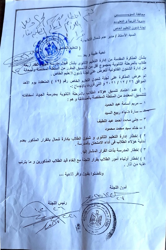 وفوجئ 4 طلاب من مدرسة الجهاد الخاصة وهم مريم اسامة عبد الحميد وسارة ضياء ربيع وجنى محمد أحمد و خالد سيد محمد بتبيلغهم يوم ٣٠ ديسمبر ٢٠٢١ بمنعهم من دخول الامتحانات هذا العام بسبب عدم تجاوز مجموعهم ١٩٥ درجة هو التنسيق المقرر والمعتمد من اللواء عبد المجيد صقر محافظ السويس .