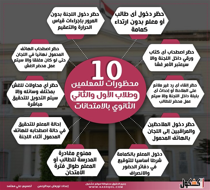 جراف انفوجراف.. 10 محظورات للمعلمين وطلاب الأول والثاني الثانوي بالامتحانات نورهان عبد الرحمن الأربعاء 12/يناير/2022 - 04:18 م 1/12/2022 4:18:00 PM طباعة facebook twitter whats شارك طلاب الثانوي امتحانات المحظورات الطلاب الثاني الثانوي التعليم