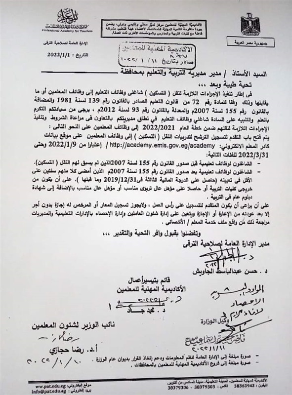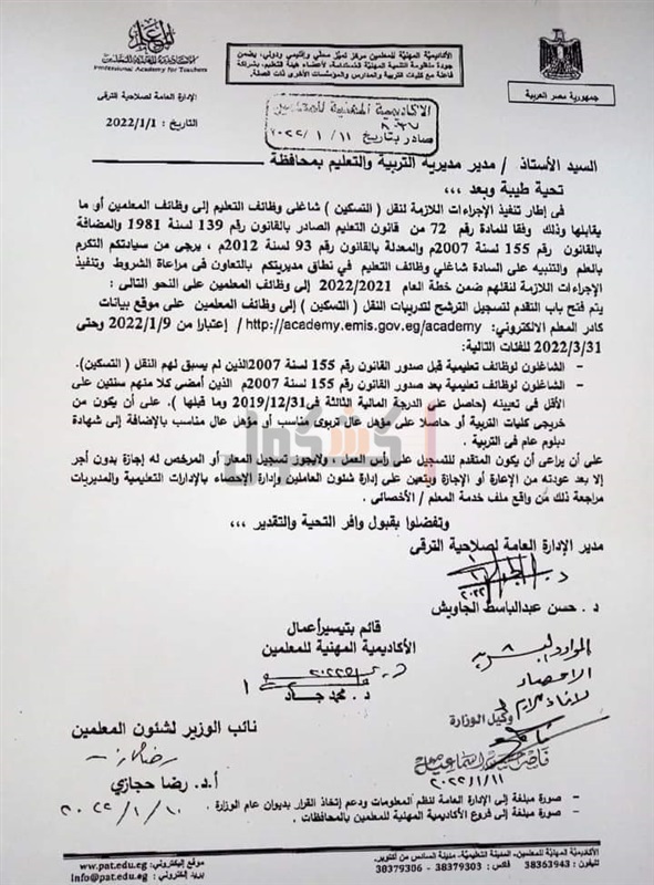 - الشاغلون لوظائف تعليمية قبل صدرو قانون 155 لسنة 2007 الذين لم يسبق لهم التسكين