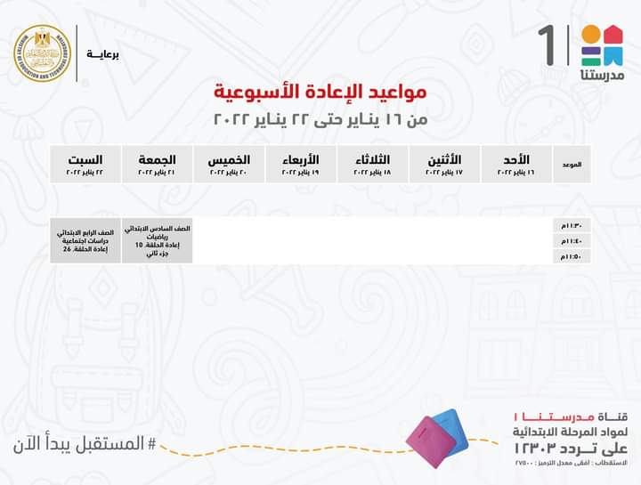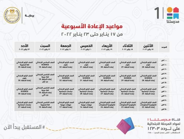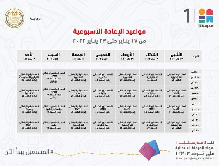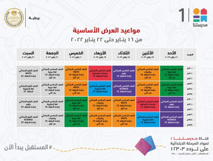 أعلنت القناة التعليمية مدرستنا، لطلاب وأولياء أمور مواعيد عرض البرامج التعليمية للصفوف الابتدائية، باللغة العربية مع الإعادة، على قناة مدرستنا 1.