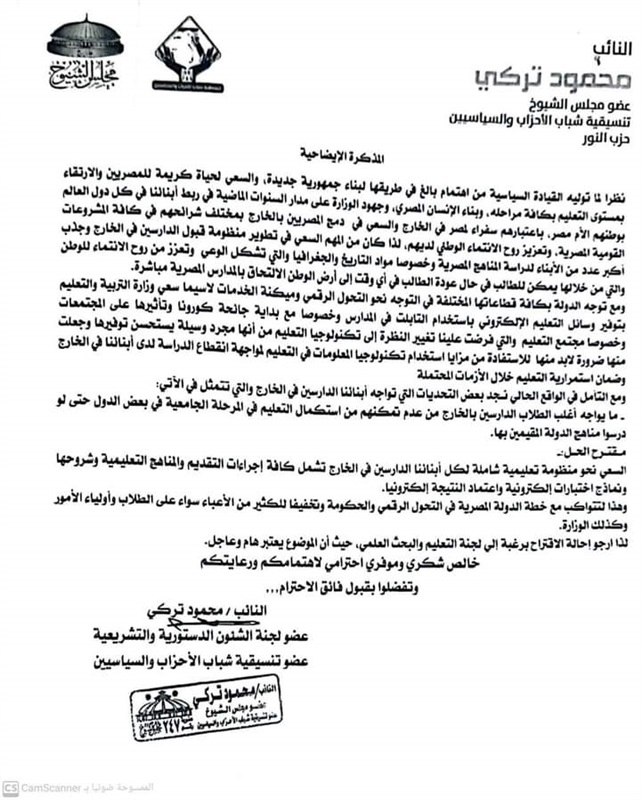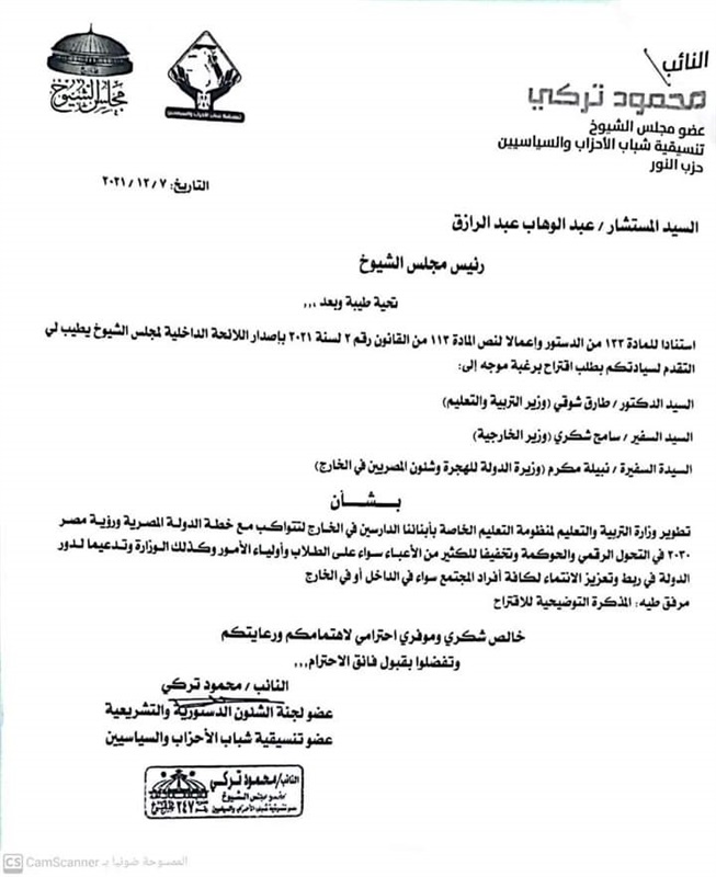 وافقت لجنة التعليم والبحث العلمي بمجلس الشيوخ، على الاقتراح برغبة المقدم من النائب محمود تركي، عضو مجلس الشيوخ عن تنسيقية شباب الأحزاب والسياسيين عن حزب النور، بشأن تطوير وزارة التربية والتعليم لمنظومة التعليم الخاص بأبناء المصريين الدارسين بالخارج، وذلك بحضور ممثلي الحكومة.