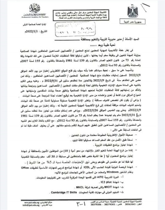 كما شدد أنه سيراعي أن يكون لكل تخصص کشوف مستقلة (وتعتبر الإدارة التعليمية مسئولة مسئولية كاملة عن صحة تلك البيانات، وتسليم کشوف البيانات مرفقة للملفات إلى فرع الأكاديمية المهنية للمعلمين التابعة له، وذلك إعتبارا من يوم الأحد الموافق 2/1/9 202م وحتى يوم الخميس الموافق 2/5/26 202م ويراعی عدم إستلام ملفات من تجاوز مدة تعاقده سنتين في تاريخ 2022/5/31 مالم يتم تجديدها عملا بحكم المادة رقم 73 من قانون التعليم الصادر بالقانون رقم 139 لسنة 1981، والمضافة بالقانون رقم 5 15 لسنة 07 20م والمستبدلة بالقانون رقم 93 لسنة 2012م.
