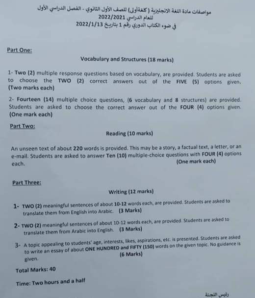 أعلنت وزارة التربية والتعليم والتعليم الفنى، مواصفات الورقة الامتحانية فى مادة اللغة الإنجليزية لطلاب الصفين الأول والثانى الثانوى العام، استعدادا لامتحانات الفصل الدراسي الأول التى تنطلق 22 يناير الجارى، حيث خصصت الوزارة نسبة للفهم والتطبيق والمستويات العليا للتفكير، مشددة على أن جميع المدارس ملتزمة بالمواصفات الفنية أثناء وضع الامتحان الورقى للطلاب ولا يجب أن يتم تجاوزها حرصا على مصلحة الطلاب، على أن يشمل أجزاء الاختبار المقرر الدراسى للفصل الدراسي الأول.