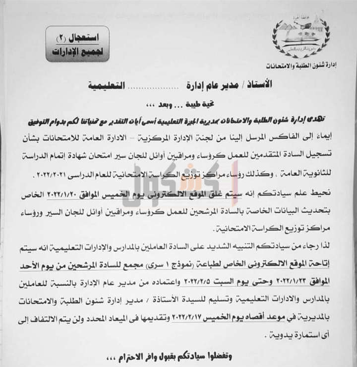 الجدير بالذكر أن الإدارة العامة للامتحانات بالوزارة، كانت قد قامت بارسال فاكس لمديريات التربية والتعليم فى المحافظات منذ أسبوع تفيد بوجود ضعف شديد فى نسب تسجيل المرشحين للعمل كرؤساء ومراقبين أوائل للجان سير امتحان شهادة إتمام دراسة الثانوية العامة، وكذلك رؤساء مراكز توزيع الورقة الامتحانية للمشاركة فى أعمال امتحانات الثانوية العامة للعام الدراسى ٢٠٢٢/٢٠٢١.