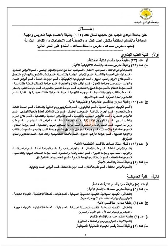 أعلنت جامعة الوادي الجديد، عن حاجتها لشغل عدد (124) وظيفة لأعضاء هيئة التدريس والهيئة المعاونة بالأقسام المختلفة بكليتي الطب البشري والصيدلة لسد الاحتياجات من الكوادر البشرية (معيد - مدرس مساعد - مدرس - أستاذ مساعد - أستاذ) على أن يكون التقديم خلال الفترة من الأحد 23/1/2022 حتى الأحد 6/2/2022.