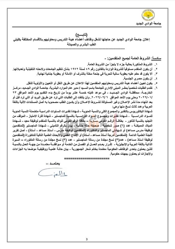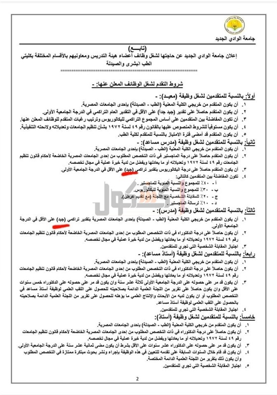 واوضحت جامعة الوادي الجديد، أن من شروط الحصول على الوظيفة تقدير الدرجة الجامعية الأولى لوظائف المدرس والمدرس المساعد المعلن عنها في كليتي الطب والصيدلة على أن يكون المتقدم حاصلاً على درجة البكالوريوس بتقدير تراكمي (جيد) على الأقل في الدرجة الجامعية الأولى بدلا من (جيد جدا).