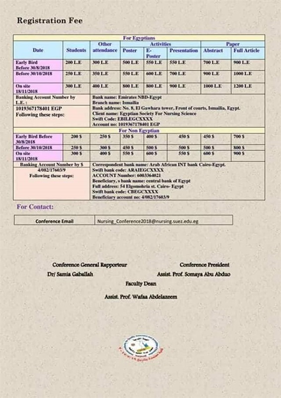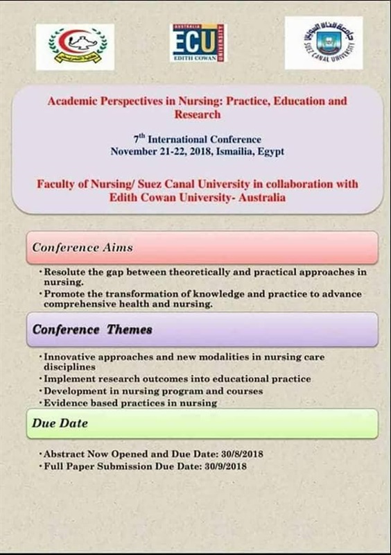 تحت رعاية الدكتور ممدوح غراب رئيس جامعة قناة السويس والدكتورة ماجدة هجرس نائب رئيس الجامعة لشئون الدراسات العليا والبحوث و الدكتورة وفاء عبدالعظيم الحسيني عميد كلية التمريض وإشراف الدكتورة سميه السيد أبو عبده وكيل الكلية للدراسات العليا والبحوث تنظم كلية التمريض جامعة قناة السويس مؤتمرها الدولي السابع بالتعاون مع جامعة ايديث كوان باستراليا والذي سوف يعقد في الفترة من 21-22 نوفمبر 2018 تحت عنوان