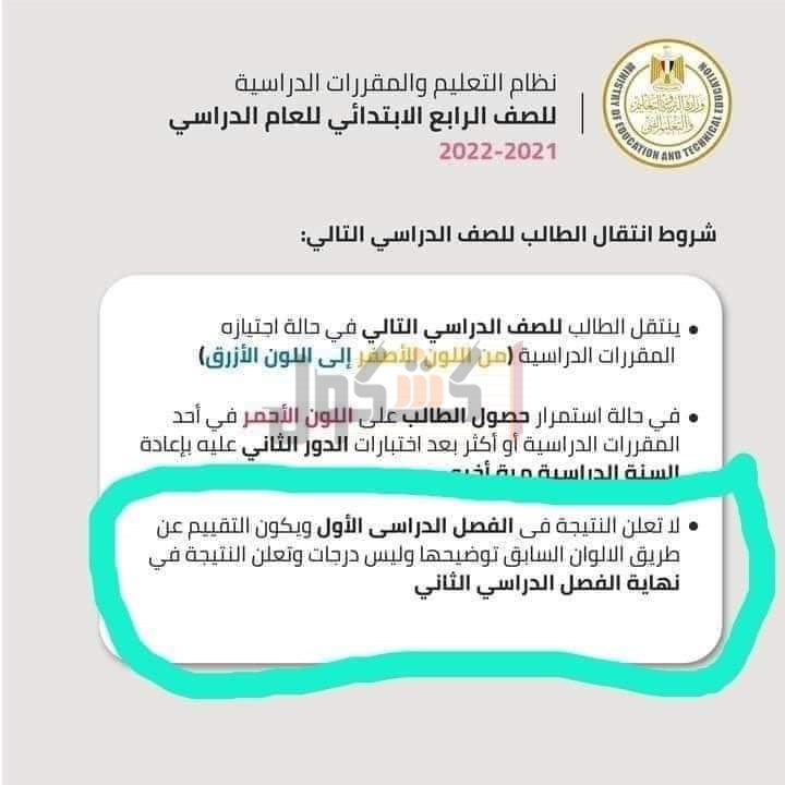 وأكدت وزارة التربية والتعليم والتعليم الفني، أنه لن يتم الإعلان عن نتيجة الفصل الدراسي الأول لطلاب الصف الرابع الابتدائي، لأن ذلك ضد فلسفة التغيير والتطوير القائمة على الاهتمام بالتحصيل العلمي والفهم وقياس نواتج التعلم،وذلك وفقًا للقرار الوزاري 133 لسنة 2021