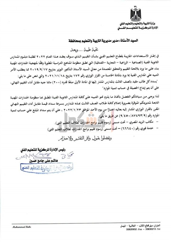 عممت وزارة التربية والتعليم والتعليم الفني، خطاب رسمي على المديريات التعليمية، بشأن الاستعدادات الجارية بقطاع التعليم الفني بشأن التقييم الذي سوف يعقد لطلبة دبلوم المدارس الفنية الصناعية _ الزراعية _ التجارية_ الفندقية التي تطبق مناهج الجدارات.