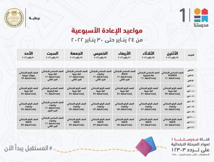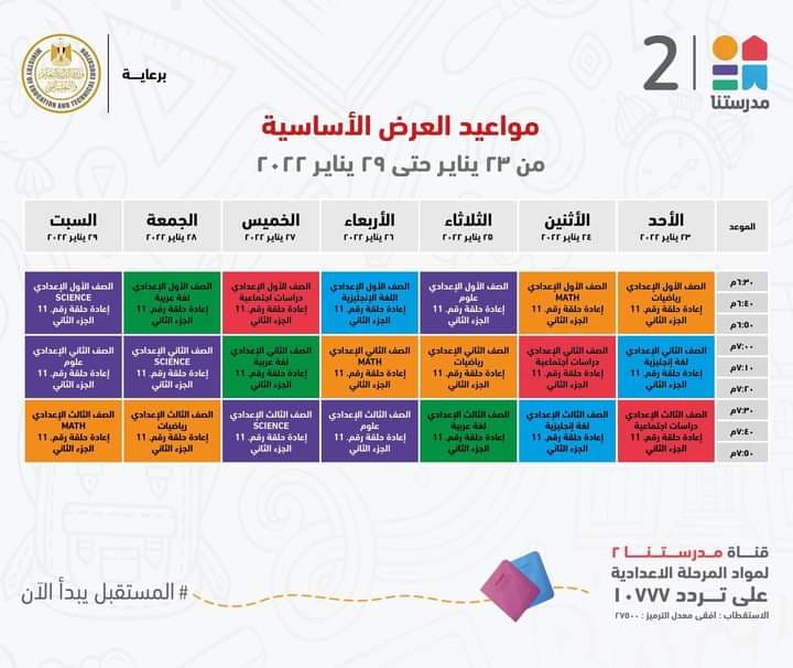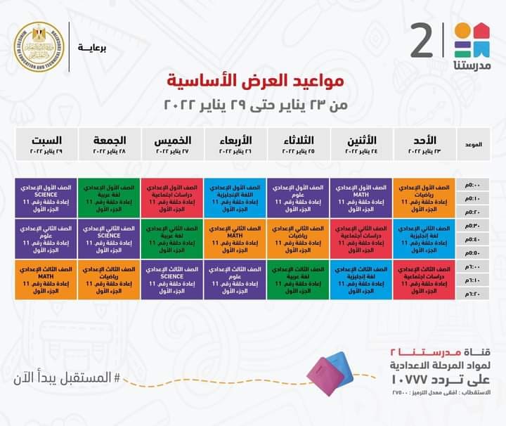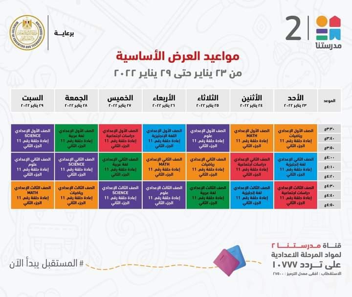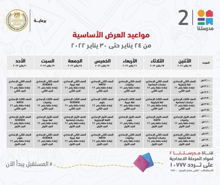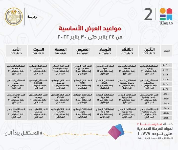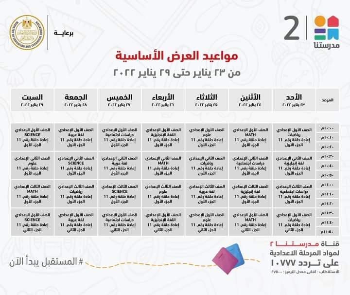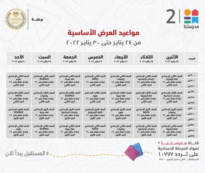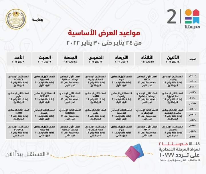 أعلنت وزارة التربية والتعليم والتعليم الفني، لأولياء الأمور وطلاب المرحلتين الابتدائية والإعدادية، مواعيد عرض البرامج التعليمية للمناهج المدرسية على قناة " مدرستنا ١، ٢" من ٢٣ يناير حتى ٣٠ يناير بالإضافة إلى مواعيد الإعادة.