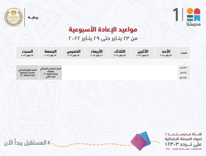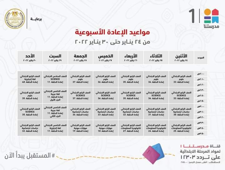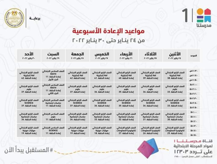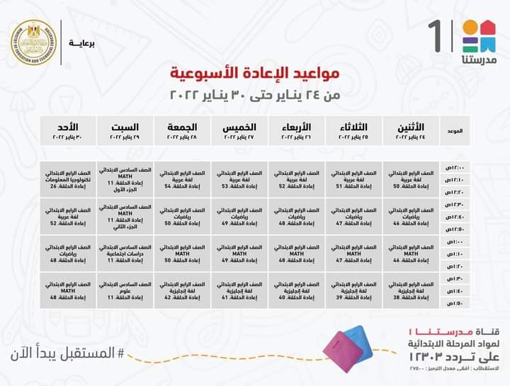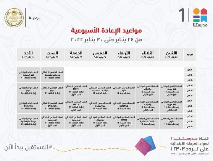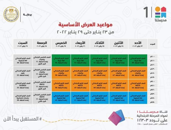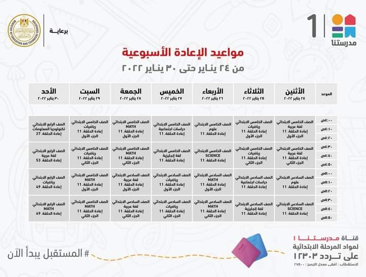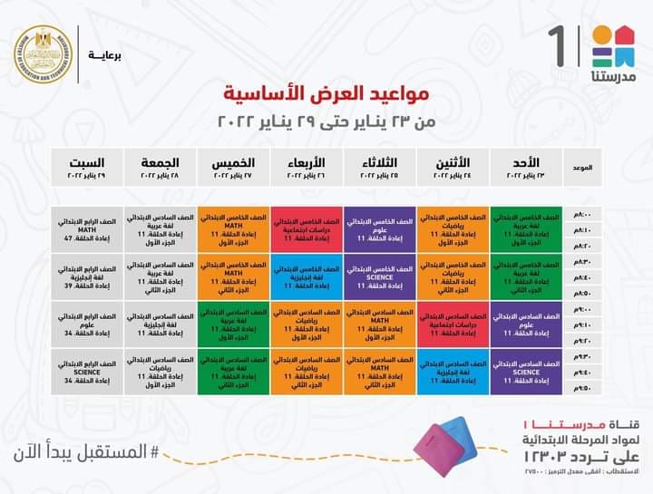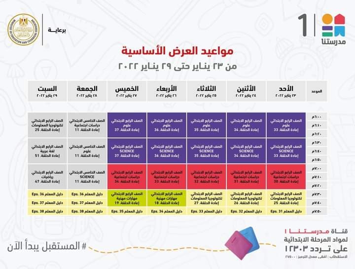 أعلنت وزارة التربية والتعليم والتعليم الفني، لأولياء الأمور وطلاب المرحلتين الابتدائية والإعدادية، مواعيد عرض البرامج التعليمية للمناهج المدرسية على قناة " مدرستنا ١، ٢" من ٢٣ يناير حتى ٣٠ يناير بالإضافة إلى مواعيد الإعادة.