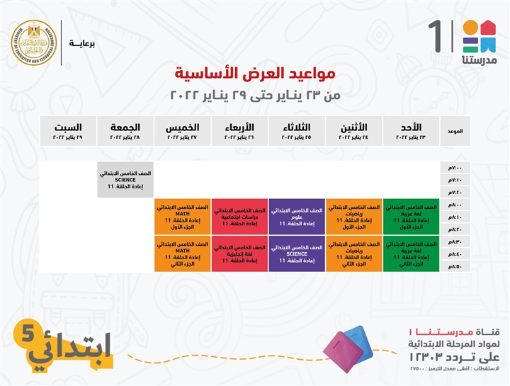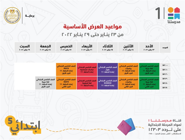 أمور وطلاب الصف الخامس الابتدائي، معرفة مواعيد عرض الدروس التعليمية من خلال مشاهدة
