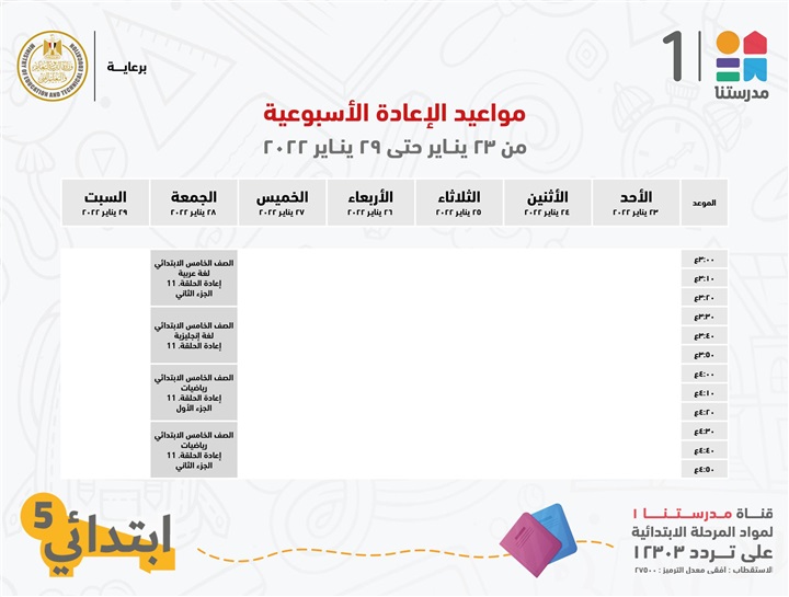التعليمية مدرستنا 1، الجدول الخاص لمواعيد بث شرح الدروس التعليمة للصف "الخامس