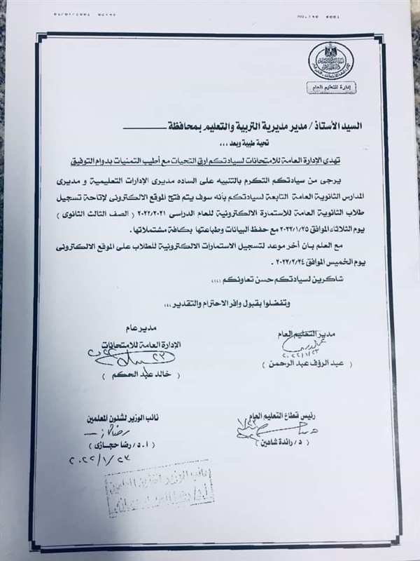 وجاء الخطاب بتوقيع الدكتور رضا حجازي نائب وزير التربية والتعليم لشؤون المعلمين ، والذي نص علي ان التنبيه على مديرى الإدارات التعليمية و مدیری المدارس الثانوية العامة التابعة لكم بأنه سوف يتم فتح الموقع الألكتروني لإتاحة تسجيل طلاب الثانوية العامة للاستمارة الالكترونية للعام الدراسی ۲/۲۰۲۱ ۲۰۲ ) الصف الثالث الثانوی ) ، يوم الثلاثاء الموافق ۲/۱/٢٥ ۲۰۲ مع حفظ البيانات وطباعتها بكافة مشتملاتها ، مع العلم بان أخر موعد لتسجيل الاستمارات الألكترونية للطلاب على الموقع الالكتروني يوم الخمیس الموافق ٢٤/ ٢/ ٢٠٢٢م .