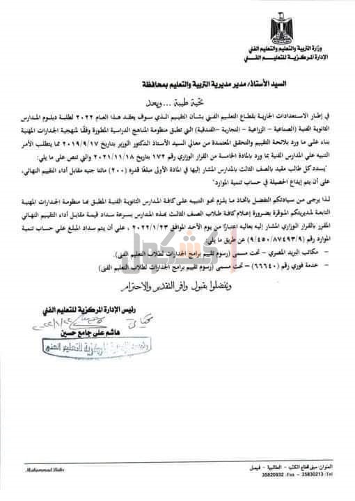 كما شدد الخطاب، أنه يرجی التفضل باتخاذ ما يلزم نحو التنبيه على كافة المدارس الثانوية الفنية المطبق بها منظومة الجدارات المهنية التابعة لمديريتكم الموقرة بضرورة إعلام كافة طلاب الصف الثالث بهذه المدارس بسرعة سداد قيمه مقابل أداء التقييم النهائي المقرر بالقرار الوزاري المشار إليه بعاليه اعتبارا من يوم الأحد الموافق ۲/۱/۲۳ ۲۰۲، علي أن يتم سداد المبلغ علي حساب تنمية الموارد رقم ٩/ ٨٧٤٩٣/ ٤٥٠/ ٩)