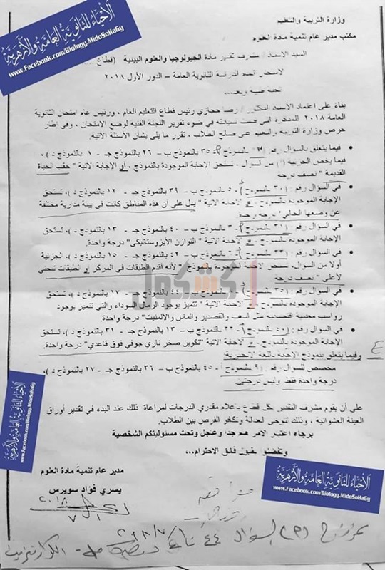 على نموذج إجابة امتحان الجيولوجيا والعلوم البيئية، الذي أداه طلاب شعبة العلوم بالثانوية