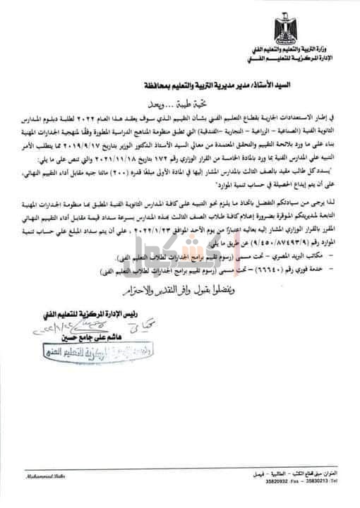 بقطاع التعليم الفني بشأن التقييم الذي سوف يعقد لطلبة دبلوم المدارس الفنية الصناعية