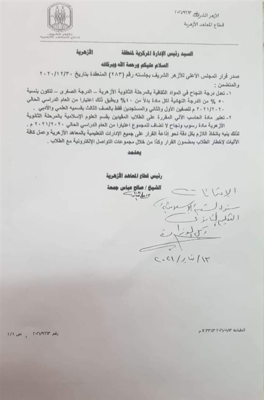 وطالب الأزهر الشريف، جميع القطاعات بضرورة اتخاذ اللازم نحو إذاعة القرار على الإدارات التعليمية بالمعاهد، وإخطار الطلاب بها.