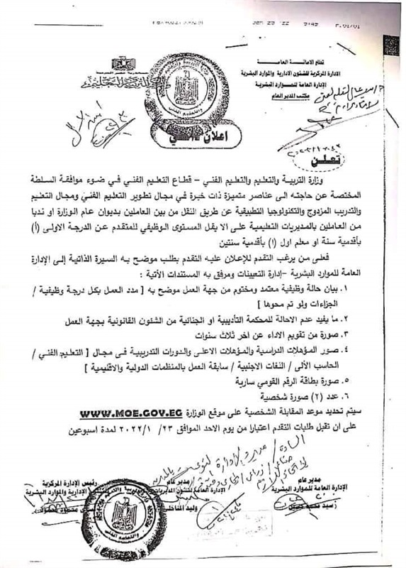 وجاء نص الخطاب، اعلان وزارة التربية والتعليم والتعليم الفني - قطاع التعليم الفني في ضوء موافقة السلطة المختصة عن حاجته إلى عناصر متميزة ذات خبرة في مجال تطوير التعليم الفني ومجال التعلیم