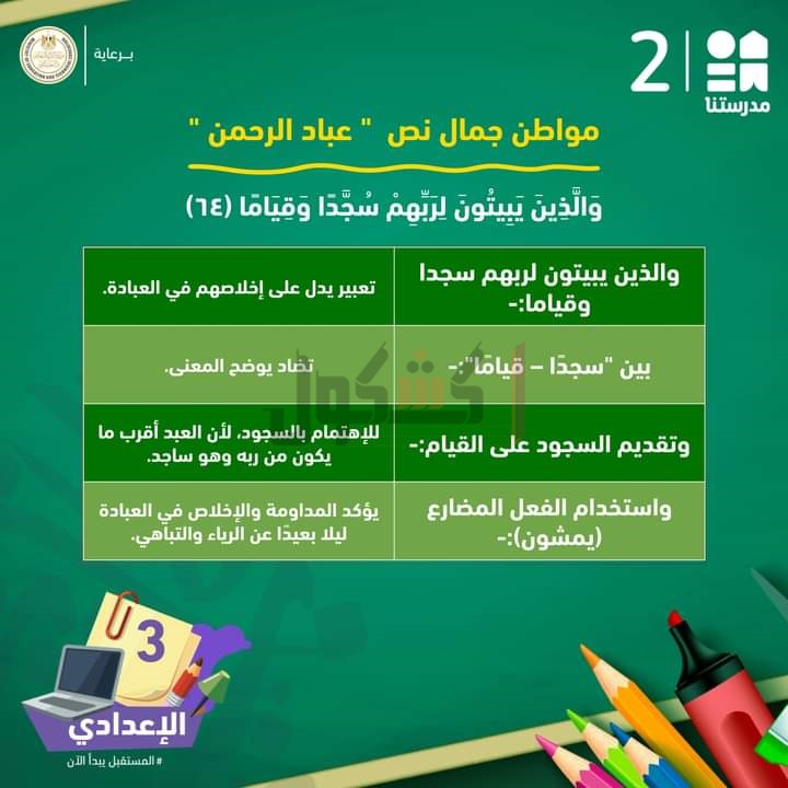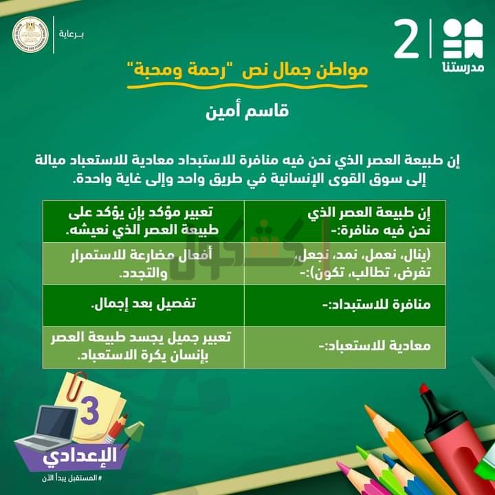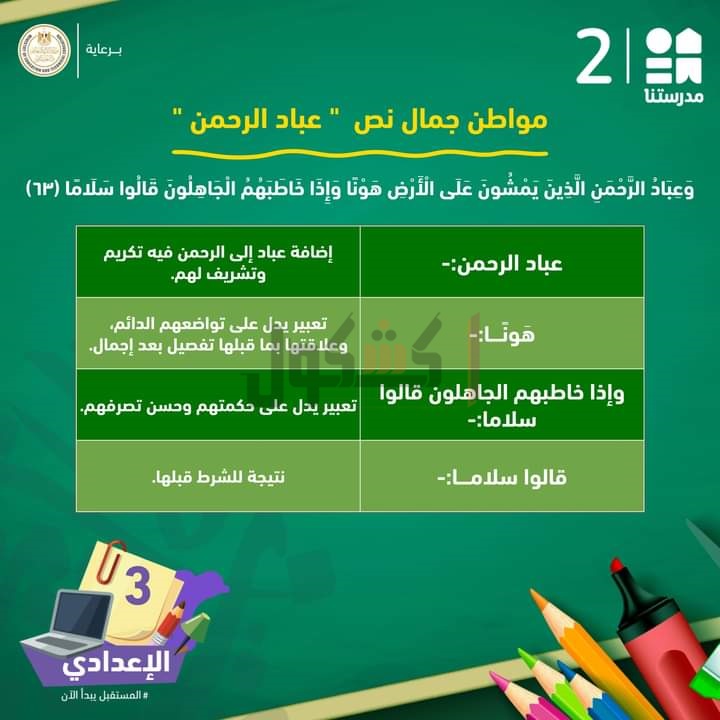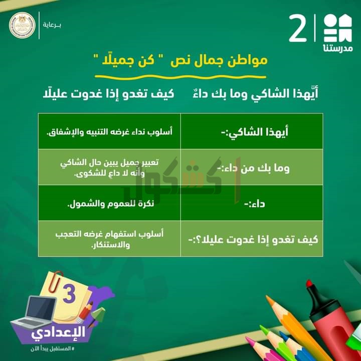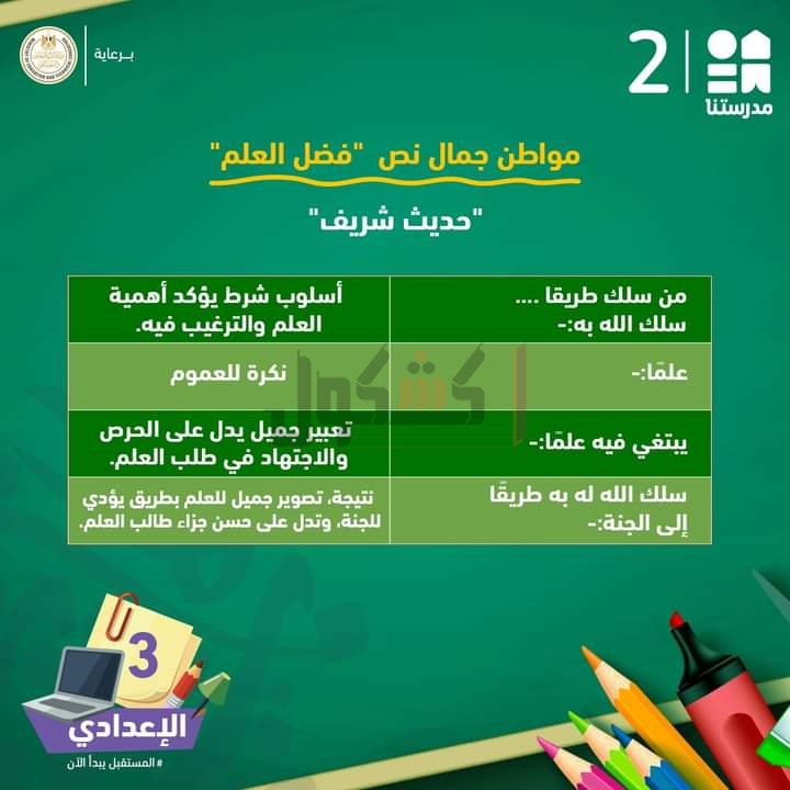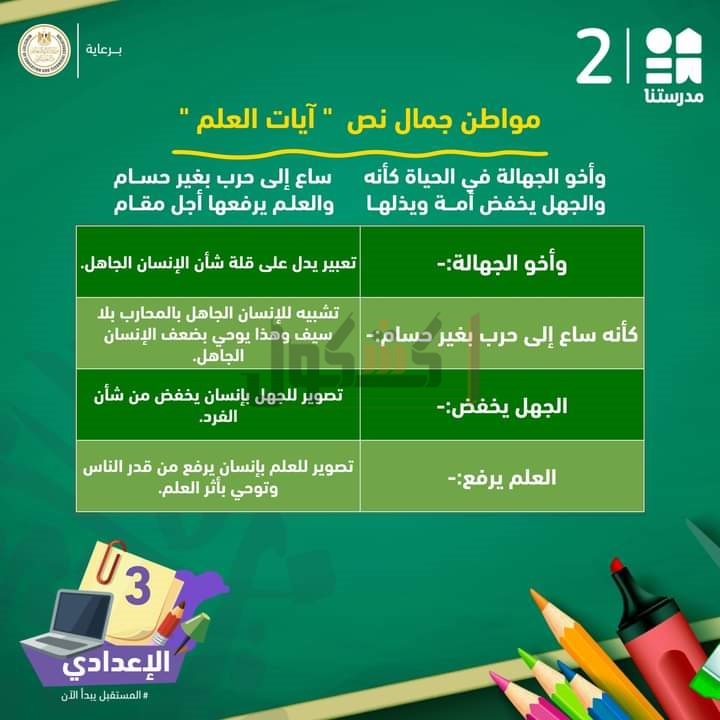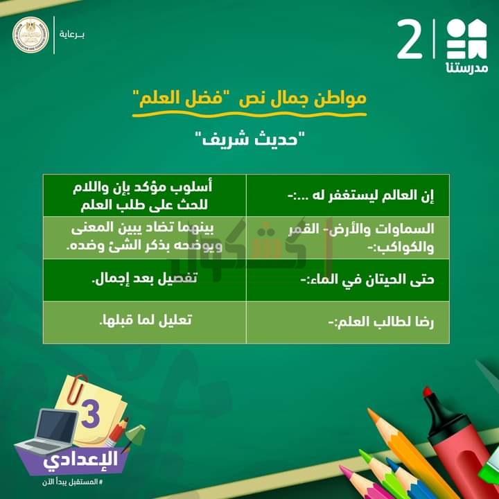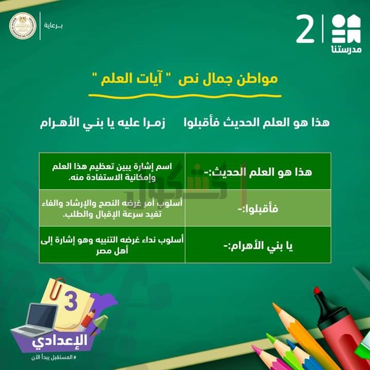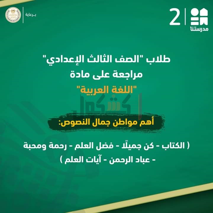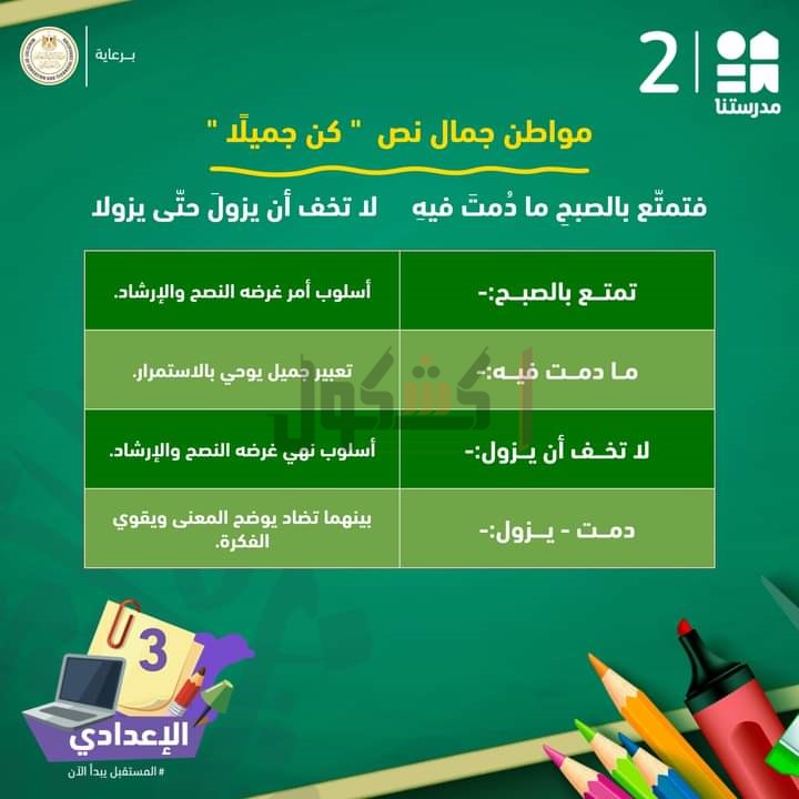 كشفت القناة التعليمية مدرستنا، لطلاب الشهادة الإعدادية قبيل امتحان اللغة العربية لنهاية الفصل الدراسي الاول للعام 2021_ 2022، عن أهم مواطن الجمال المقررة.